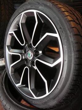 Špičkové německé lité disky pro vozy ŠKODA VW SEAT AUDI apod. (foto na voze pouze ilustrační - vše je zcela nové-nepoužité, zkompletované=obuto+vyváženo). Zkompletováno - obuto+vyváženo. Loga škoda nejsou v ceně - pouze ilustrační foto.