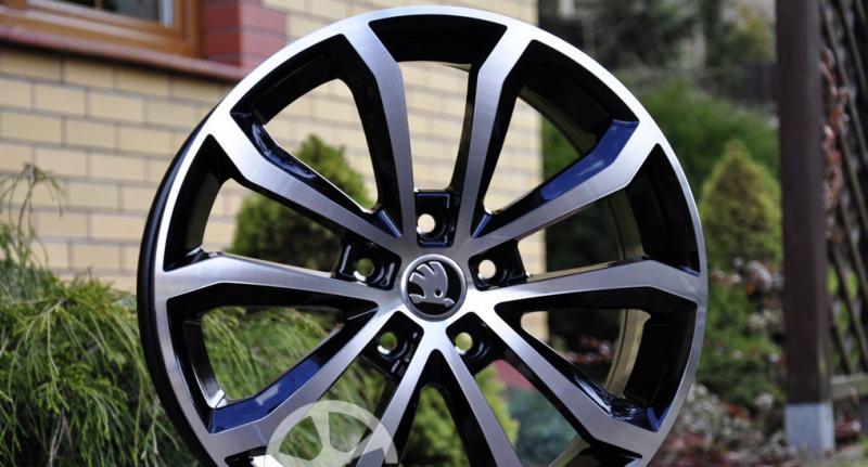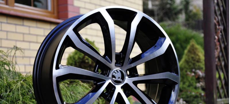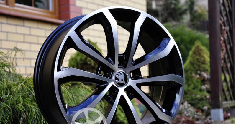 Efektní, lité disky v provedení "černé+leštěné" pro vozy VW, AUDI, ŠKODA, SEAT, FORD apod. Foto s logy ŠKODA pouze ilustrační, dodáváno s černými stř.pokličkami bez loga ! (pasují loga originál VW/ŠKODA. Loga VW/ŠKODA/AUDI možno dodat zvlášť za 100- Kč/ks)