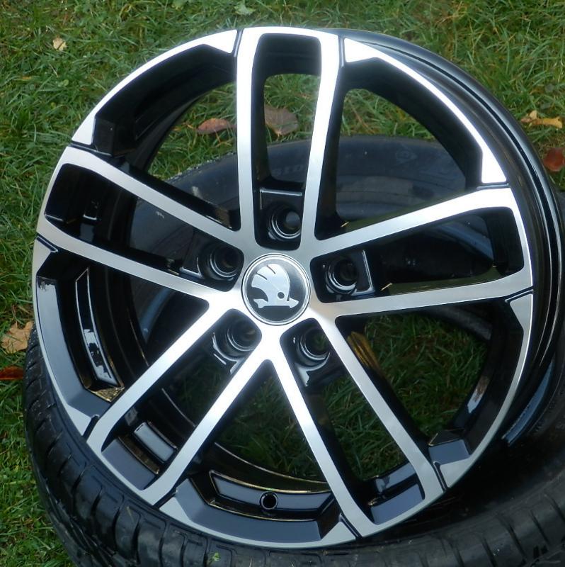 Efektní lité disky v provedení "černá+leštění". Loga ŠKODA nejsou součástí kol, pouze ilustrační foto. Loga AUDI VW SKODA SEAT možno dodat zvášť za 100,- Kč/ks. Do vyprodání lze i s et35